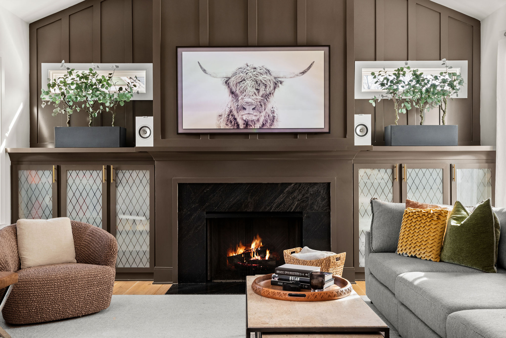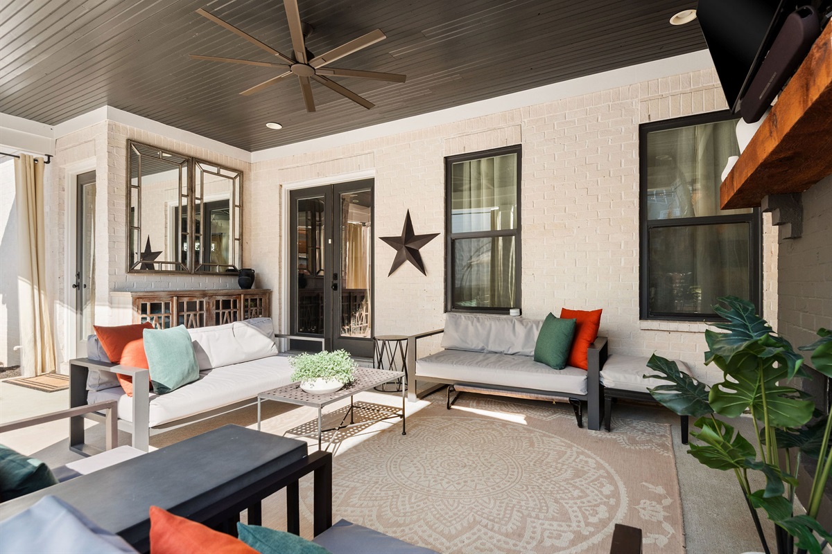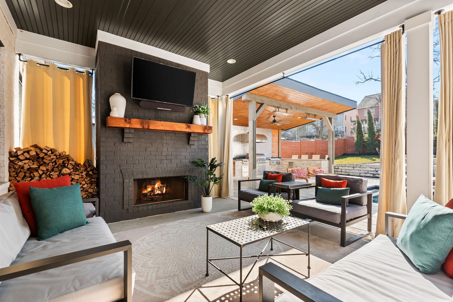 Gather around the fire pit for smores and stories or bask in the warmth of the outdoor fireplace while enjoying your favorite show on the mounted TV.